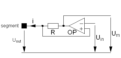 The electronic loads are realized with operational amplifiers which work as current source or sink. So the device can be used on the anode or optionally on the cathode side. The voltage after the resistor R is feed back to the operational amplifier OP. So the voltage Uout at the segment is held constant at the voltage of the input Uin. The voltage Um is measured and the current which flows out of the segment or into the segment is calculated with help of the formula.