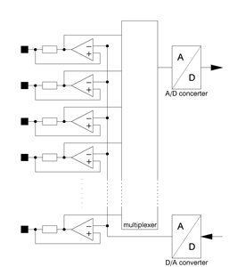 Many of these electronic loads are connected with a multiplexer which switches the voltages Um to an Analog-to-Digital converter. The inputs are connected together and the voltage Uin is provided by an Digital-to-Analog converter. This is shown in the following picture.